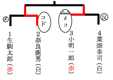 | 対戦スコアのつけ方 ?面はメ、小手はコ、胴はドと書きます。 ?反則は△(反、▲)を取られた方に書きます。 ?1本目には◯をつけます。 ?反則が2つで対戦相手に1本が入るため、△△を線で消し△△相手に反と書きます。 例)第1試合、生駒君と奈良君の対戦で、先に生駒君が面を決め、その後奈良君が小手を決め、勝負の3本目は奈良君が胴を決め勝利しました。 第2試合、小明君が場外反則2回で菜畑君に1本、その後小明君が面を取り返し、勝負の3本目にまたもや小明君が小手を決めた。 |
